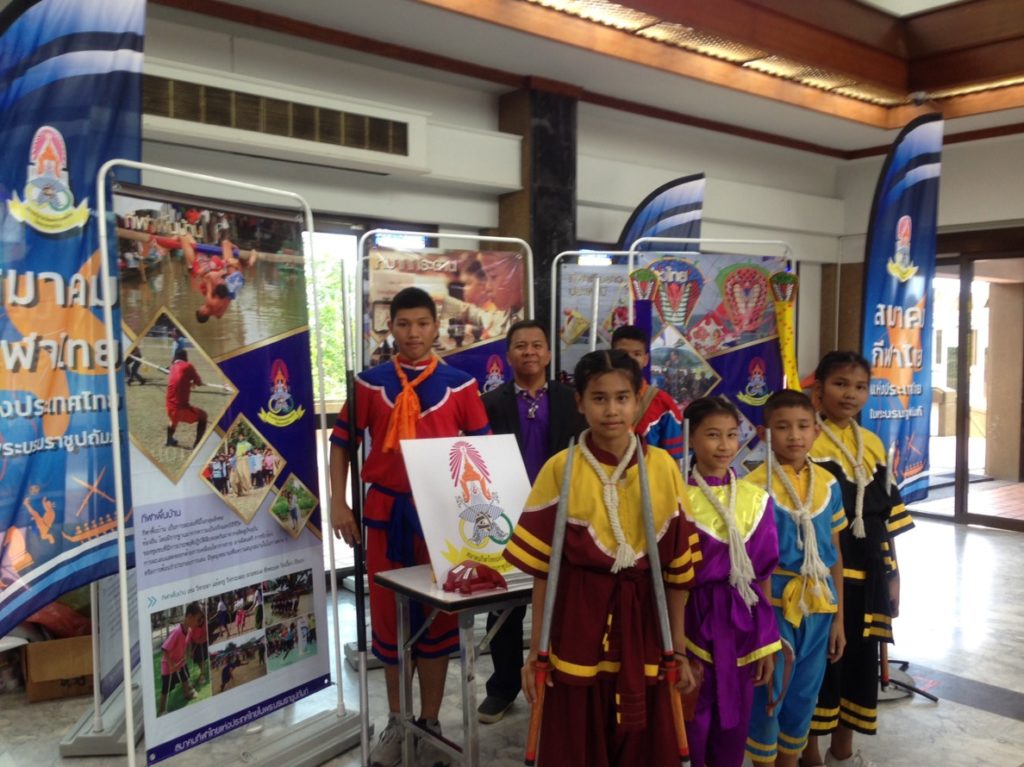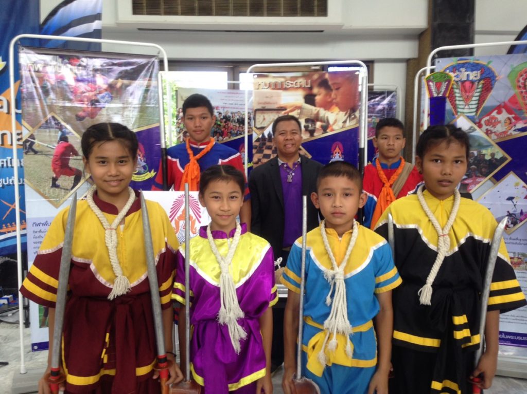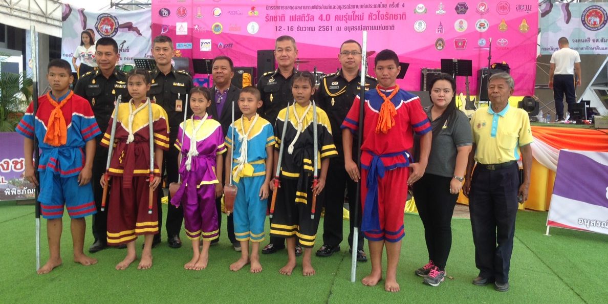 การแสดงกระบี่กระบอง โดยสมาคมกีฬากีฬาไทยแห่งประเทศไทยในพระบรมราชูปถัมภ์ ในงานรักชาติ 4.0คนรุ่นใหม่หัวใจรักชาติ ณ อนุสรณ์สถานแห่งชาติ กรุงเทพมหานคร